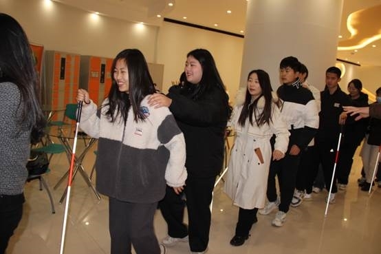 在黑暗体验厅,师生们手持盲杖,排成一列,搭着同伴的肩膀,有序进入“黑暗世界”,体验视障人士的生活。黑暗体验厅由居家生活体验、商场购物体验、著名景区游览体验、传统文化体验区、盲文学堂体验等区域组成。大家在讲解员柔和却有力的声音引导下,顺利完成了对黑暗体验厅的体验。第一次来到黑暗体验厅的同学,实际感受与之前的想象差异较大,有点害怕和犹豫,时刻睁大双眼,寻觅一丝光亮,置身黑暗世界,毫无边界概念,失去空间信息,很压抑。重返“光明”后,同学们感受到生命的珍贵,更加热爱生命,感恩可以用双眼看到美好的世界。大家表示在以后的生活里要更加关注残疾人士,给予他们力所能及的帮助和关爱。