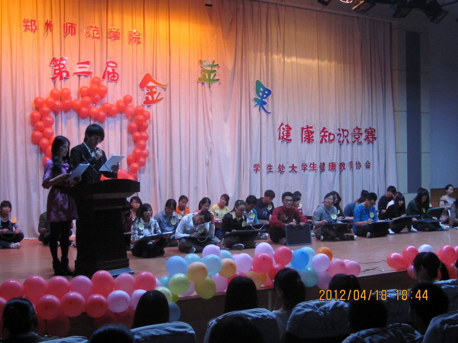 为丰富大学生的健康知识,享受健康人生。4月18日晚,由学生处主办,大学生健康教育协会承办的郑州师范学院第三届金苹果健康知识竞赛在七号楼学术报告厅举行,大学生健康教育协会指导老师李宛青教授、社团联合会副主席张莉及部分社团的负责人出席了此次比赛并担任评委。