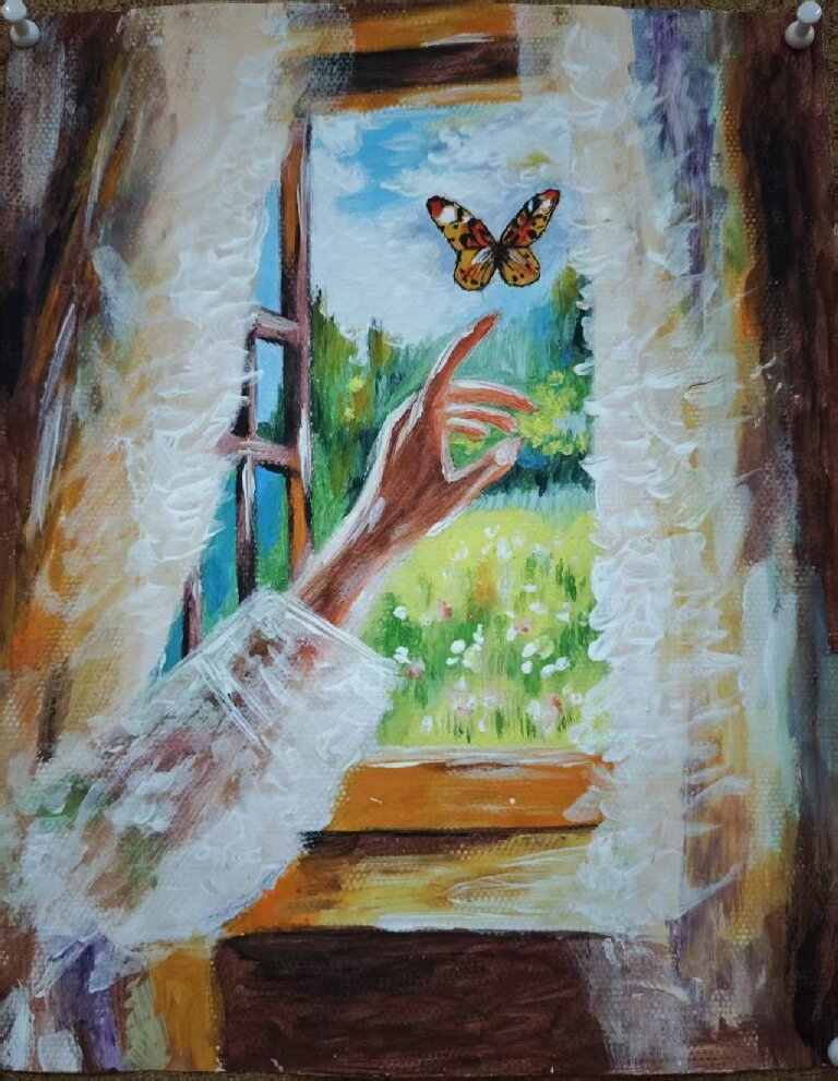 以“手伸向窗边蝴蝶”为核心,窗外明媚风景与室内手蝶相映,传递“如接纳蝴蝶般平和接纳情绪,在与自然美好的互动中实现自我成长”的理念,寓意以温柔姿态应对压力,守护心理健康。