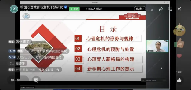 本次直播主要围绕“心理危机的形式与规律”、“心理危机的预防与处置”、“心理育人新格局的构建”、“新学期心理工作的提示”四个方面展开。课程内容紧密结合当前学生心理健康教育的实际需求,为专兼职心理咨询师和辅导员老师们提供了实用的工具和方法。
