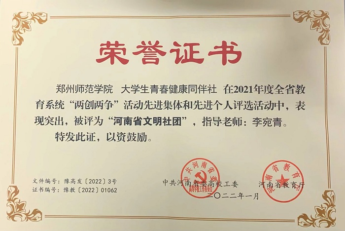在2021年度全省教育系统“两创两争”活动先进集体和先进个人评选活动中,因我校大学生青春健康同伴社表现突出,被中共河南省委高校工委和河南省教育厅评为“河南省文明社团”,指导老师李宛青。