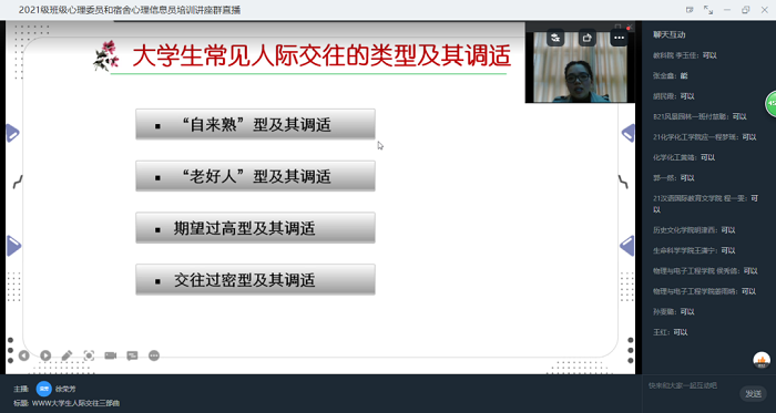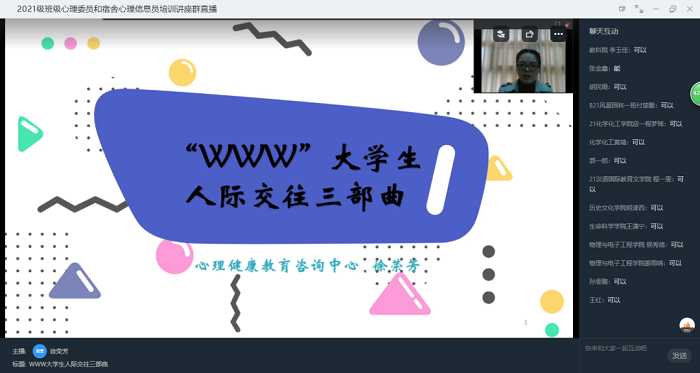 为提高我校2021级新生班级心理委员和宿舍心理信息员的工作能力,根据疫情防控的要求,2022年3月29日下午3:00,我校心理健康教育咨询中心以线上钉钉直播的方式举办了“WWW大学生人际交往三部曲”班级心理委员和宿舍心理信息员培训讲座,近500名2021级班级心理委员和宿舍心理信息员参与,由心理健康教育咨询中心徐荣芳老师主讲。