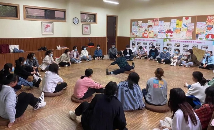 2022年4月12日下午3点, 由心理健康教育咨询中心主办的“动静结合,身呼吸”团体心理辅导在文博楼C116团体辅导室开展,各学院共32名心理委员代表参加,心理健康教育咨询中心高砚芳老师带领。