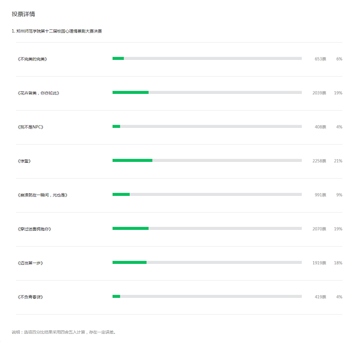 4月29日-5月3日通过网络投票及评委打分两个环节,最终郑州师范学院第十二届校园心理情景剧大赛的结果是:
