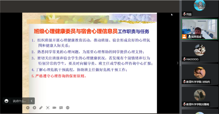 为提高我校2022级新生班级心理委员和宿舍心理信息员的工作能力,更好地为我校学生提供心理支持陪伴,2022年10月11日下午2:30,心理健康教育咨询中心在腾讯会议平台举办了“心灵使者 真情陪伴”班级心理委员和宿舍心理信息员培训,近300名2022级班级心理委员和宿舍心理信息员参与,李宛青老师主讲。