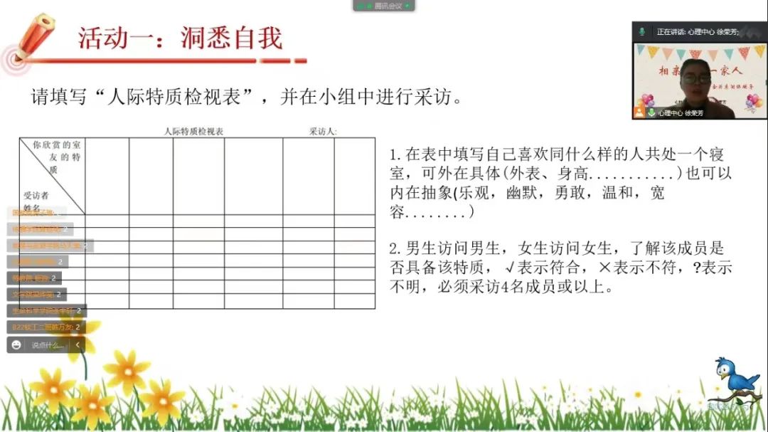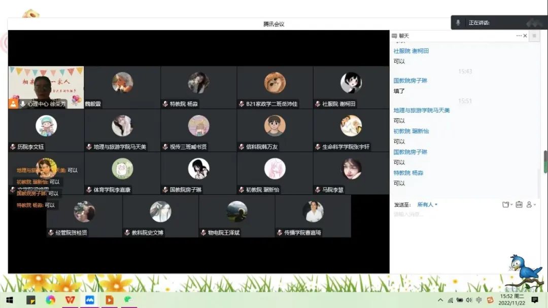疫情无情人有情,为促进同学之间形成温暖融洽的宿舍关系,增进朋友之间的友谊,2022年11月22日下午3:00,心理健康教育咨询中心在腾讯会议举办了“相亲相爱一家人——宿舍关系团体辅导”活动,通过招募共有来自各个学院的18名同学参与,徐荣芳老师为领导者。