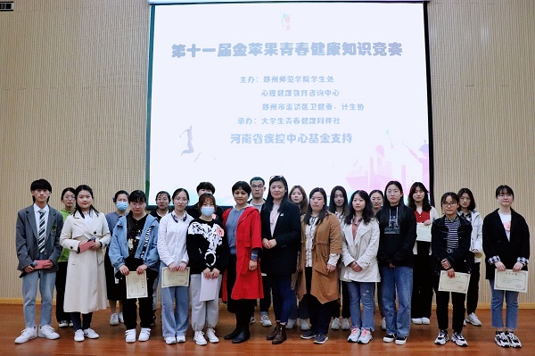为使我校同学能在轻松愉悦的环境下了解掌握更多青春健康知识, 2021年4月20日下午3点,由河南省疾控中心基金支持,学生处心理健康教育咨询中心联合惠济区卫健委计生协主办、大学生青春健康同伴社承办的“第十一届金苹果青春健康知识竞赛”在嵩山学堂第二报告厅成功举办,惠济区卫健委计生协李杰老师,心理健康教育咨询中心李宛青、吕喆老师,社团联合会梁潇、田一凡同学担任评委,杨杰、陈仲刚同学主持,各学院学生代表积极参与。