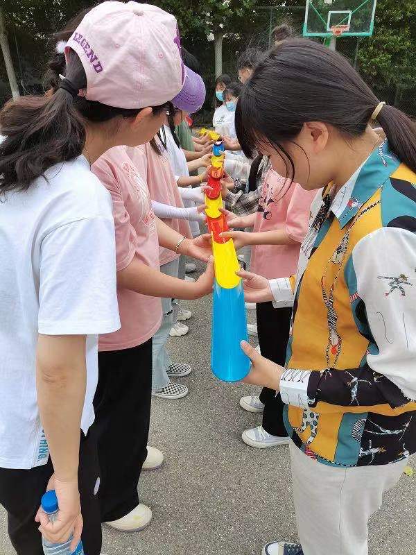 首先是团建活动,大家被分成5个小组,每小组选出自己的队长,队长带领大家一起取队名、画队旗、选队呼和队歌,并在全体人员面前展示自己小队的士气。接下来的众志成城项目,所有人背靠背排成两列,左右胳膊相挽,坐下后借助左右和背后人的支撑力量站起来,不断练习站起来的速度,挑战自己的极限。随后的挑战N0.1 项目由5个子项目组成:能量传输、击鼓颠球、大河之舞、不倒森林、一圈到底,考验大家的快速反应能力、灵敏性、协调性、团队成员间的默契度和团队合作的精神,完成5个项目用时最短者荣获第一名。
