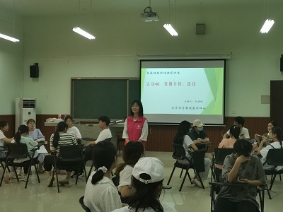 首先,主持人简单的介绍了一下此次沙龙活动的主要内容,而后带领同学们阅读了一个案例,此案例主要讲述了周军和王薇由于恋爱而影响学习的故事。接下来主持人将同学们分成五个小组,并要求同学们在组内讨论三个问题:1、你是如何看待周军或王薇的?2、究竟是什么原因导致周军或王薇陷入此困境?3、如果你是周军或王薇,你会怎样处理学习、交友等事情?为什么?然后,各小组成员把讨论结果写在大白纸上,并派一名代表发表本组观点。最后,在主持人的引导下,使同学们明白了正确选择的重要性。