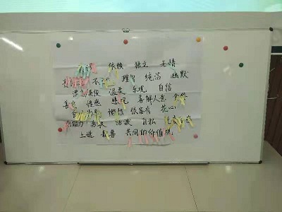 主持人通过“进入大学你最想完成的一件事是什么”引出活动主题,把几组描述人的特点的词汇,例如责任感、幽默、粗鲁……等等展示在PPT上, 让大家选出他们认为最看重的五个和最不能忍受的一个特点,从而看各自心目中未来伴侣的标准,分别在各自小组分享自己的选择结果并阐述理由,推选一名同学代表小组发言。随后,主持人让同学们连续两次分别去掉两个最看重的词并阐述理由,最后剩下一个最看重的词,各自解释为何留下这一个?在此过程中主持人不断邀请同学们在大家面前分享自己的选择和理由,随后每个人将自己的选择用彩色贴纸贴在写有所有特性的大白纸的对应位置上。整个活动过程同学们各抒己见,现场气氛非常活跃,通过同龄人各自价值观的讨论碰撞,大家共同认可的未来伴侣最重要的特性依然是责任心和共同的价值观。