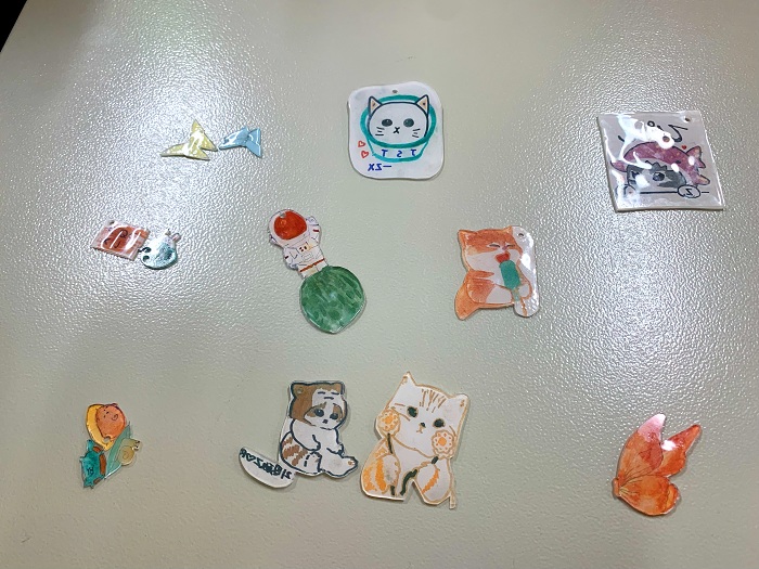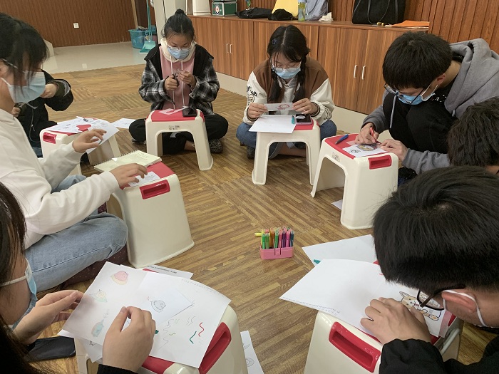 活动从心理压力测试开始,通过问卷让参与者了解自己当下的心理压力状况,接下来在压力圈图上写下最近生活中的各种压力,大圈代表大压力,小圈代表小压力。全体同学被分为4组,讨论压力的来源;每个压力球给你的感觉是怎样的;压力很大时身体的感觉如何;以及如何处理这些压力。同学们在组内进行了热烈的讨论,并分组发表观点。最后一个活动,主持人吕喆老师带领大家做手工热缩片,用彩笔描绘出自己喜欢的卡通图案在热缩片上,待图案绘制好后打孔,用热风枪吹1分钟,待热缩片完全平整时吹制完成,一个DIY钥匙链就加工完成了。同学们在制作的过程中放松了心情,释放了压力。