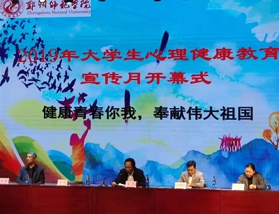 2019年10月15日下午2时30分,我校2019年大学生心理健康教育宣传月于西校区崇德楼报告厅正式开幕。此次活动由学生处心理健康教育咨询中心主办,以“健康青春你我,奉献伟大祖国”为主题,宣传心理健康知识,引导大学生把自我发展与时代呼唤相结合,培育自尊自信、理性平和、积极向上的健康心态,心怀梦想,健康成长。郑州师范学院盛宾副校长、学生处主要负责人、各学院心理健康教育负责老师、班级心理委员和宿舍心理信息员代表参与了此次活动。