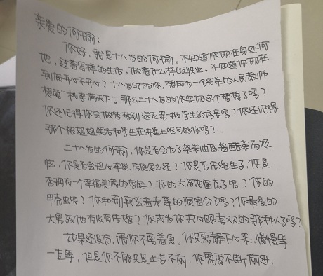 主持人首先给每位同学五分钟时间,让大家在白纸上写一封给十年后自己的信,然后在舒缓的音乐背景下,同学们以小组为单位讨论,每组均有人自告奋勇分享自己的信,同学们对十年后的自己充满了期待又给予了充分的尊重,例如一位同学分享道:十八岁的你,想成为一名光荣的人民教师,想要桃李满天下,二十八岁的你实现这个梦想了吗?…… 如果还没有,请不要着急,你只需要静下心来,慢慢等待,但你不能只是止步不前,你需要不断前进!。分享完毕主持人简短总结:人活着要有信仰和追求,有什么样的目标就有什么样的人生,人生因规划而不同,因不同而精彩。