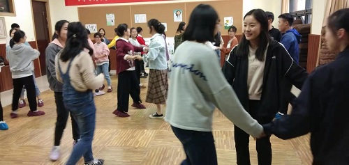 活动分四部分进行:首先由高老师引领做解析本我的介绍,以歌曲《我和我的祖国》的舞蹈展示,直抒胸臆。接下来每位到场同学依次介绍自己并以握手方式传递相逢。第二部分:游戏活动。通过"青蛙跳"活跃互动气氛,以"雨点变奏曲"表达彼此由相知后随动的快乐。第三部分:"夸夸眼中的你"。分五组进行,分别对每位参与者用真诚赞誉之词,用联结让每个人感受被认同的喜悦。第四部分:集体舞。在"青年友谊圆舞曲"的音乐伴奏中,随节奏尽情舞之,共系友谊,分享因互动而呈现的愉悦。