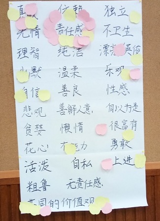 此次活动由历史文化学院彭亚轩同学主持,李宛青老师全程指导。活动开始,主持人先通过报数将在场同学分为“青”“春”“健”“康”“同”“伴”六个小组,接着让同学们看着PPT上几组描述人的特点的词汇,例如责任感、幽默、粗鲁……等等选出他们认为最看重的五个和一个最不能忍受的特点,从而看看他们心目中未来伴侣的标准。接着分别在自己小组内分享自己选择的结果并阐述理由,推选一名同学代表小组发言。随后,主持人让同学们连续两次分别去掉两个最看重的词并阐述理由,最后剩下一个最看重的词,各自解释为何留下这一个?分享后,每个人将彩色贴纸贴在写有所有特性的大白纸的对应自己最喜欢的特点上。整个活动过程同学们各抒己见,现场气氛非常活跃,通过同龄人各自价值观的讨论碰撞,大家共同认可的未来伴侣最重要的特性依然是责任心和共同的价值观。