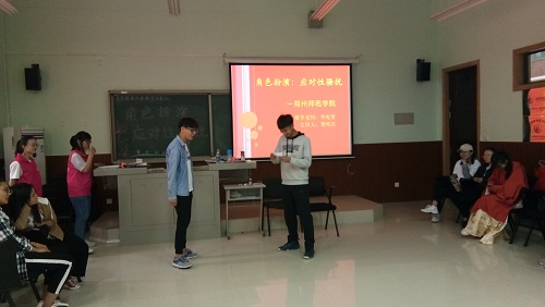 为使我校学生了解性骚扰,学会应对性骚扰,提高自我保护能力,2019年5月7日下午3点,由心理健康教育咨询中心主办、大学生青春健康同伴社承办的青春健康同伴教育沙龙之“角色扮演:应对性骚扰”在文博楼C117青春健康俱乐部成功开展,各学院学生代表及青春健康同伴社部分社员参与,文学院曹纯杰同学主持,李宛青老师全程指导。