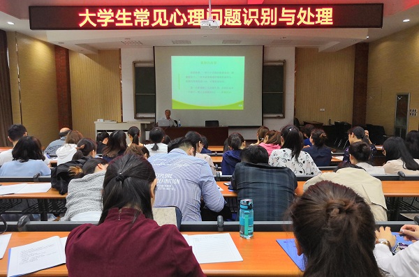 2018年9月20日下午2:30,学生处心理健康教育咨询中心主办的“大学生常见心理问题的识别与处理” 辅导员专题培训在文博楼C区一楼报告厅举行,郑州市第九人民医院心理医院院长常国胜主讲,全体辅导员参加了此次培训。