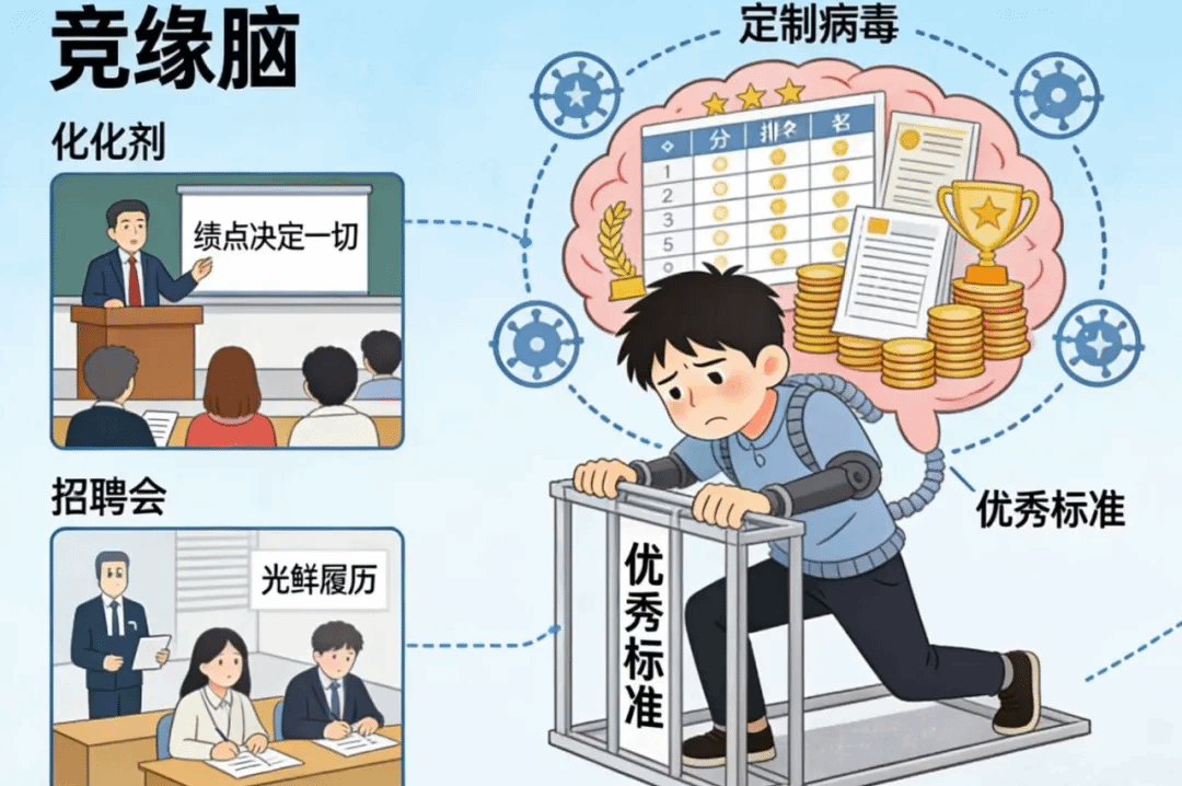 “竞缘脑”不是天生的,它是大学生活里的“定制病毒”——这种不管什么场景都要暗自较劲的思维,本质上是对优绩主义(meritocracy)的无限推崇:我们默认“越‘优秀’(分数更高、履历更光鲜)的人越该被认可”,哪怕要牺牲自己的节奏和热爱,也得往这套“优秀标准”里挤。而促成这种现象的3个催化剂,你肯定也碰到过: