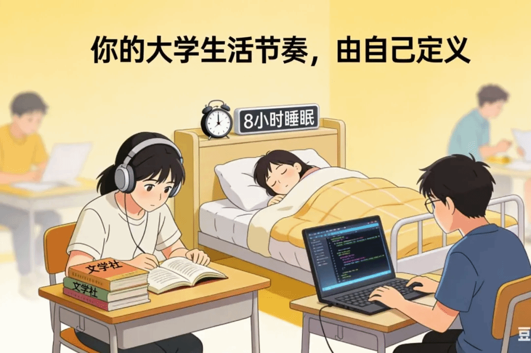 不必因为室友熬夜赶论文就硬撑着打乱作息,不必因为室友扎堆报竞赛就盲目跟风报名,更不用预设“我该和别人活得一样”。每个人的目标不同、节奏各异,你可以按自己的步调睡够8小时,顺着喜好泡进文学社,或是利用课余时间学一项新技能,哪怕和宿舍的“主流节奏”不一样也完全没关系。宿舍是共享生活的空间,却不是“统一模板车间”,少横向对比、不盲从跟风,你的大学生活节奏,从来都该由自己定义。
